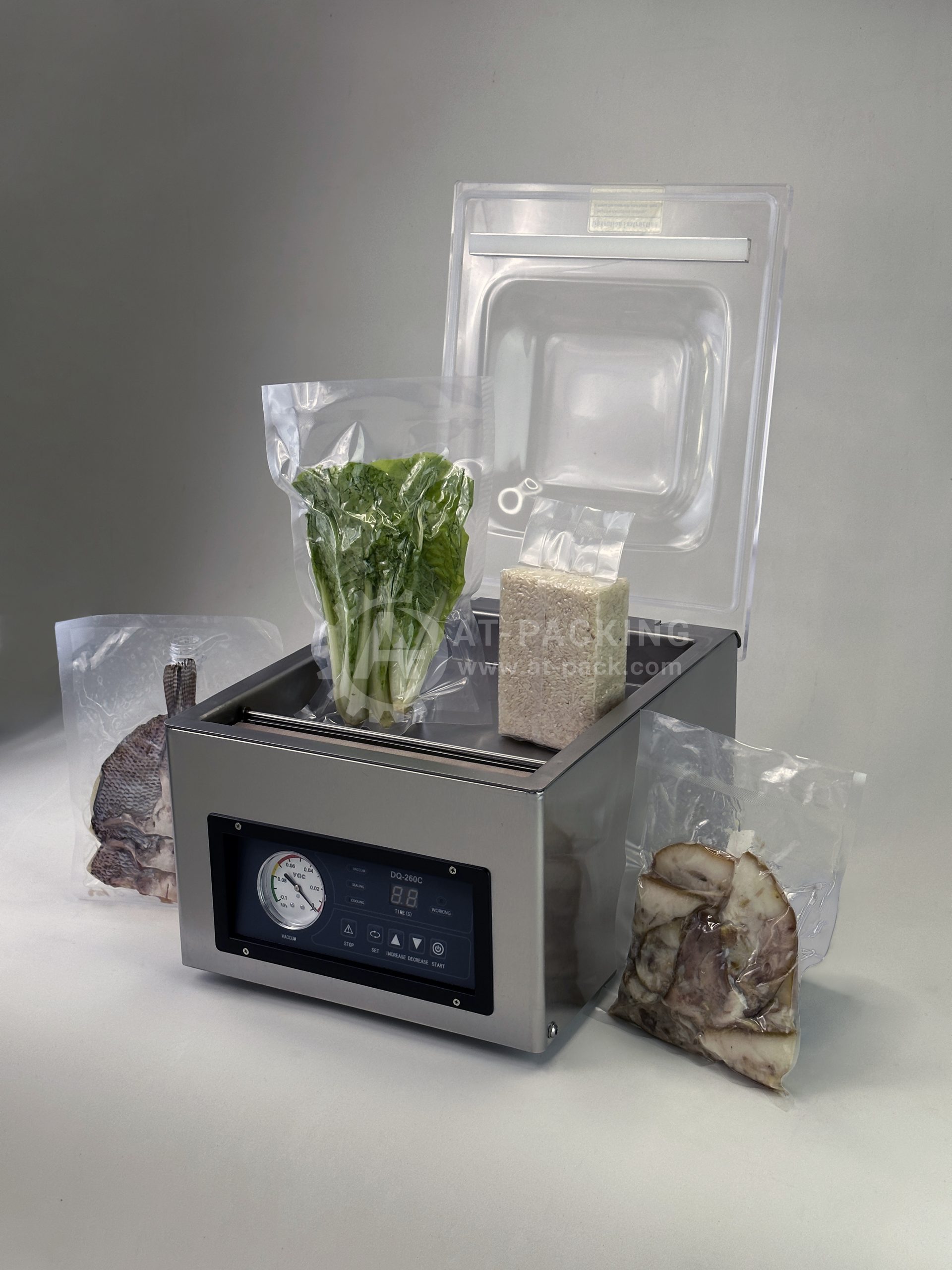 เครื่องซีลสูญญากาศ แบบตั้งโต๊ะ โครงสร้างทำด้วยแสตนเลส ทนทาน กันสนิม มีขนาดแท่งซีลยาว 260mm. หรือ 26 cm. แถบซีลปิดแน่นหนา 8 mm เครื่่องรุ่นนี้มีความสามารถพิเศษ ซึ่งสามารถซีลกับถุงได้ทุกชนิดและยังสามารถซีลสูญญากาศกลุ่มผลิตภัณฑ์ที่มีน้ำได้เป็นอย่างดี เช่น น้ำซุ๊ป , น้ำแกง , หมูสดไก่สด , หมูหมัก,ไก่หมัก เป็นต้น