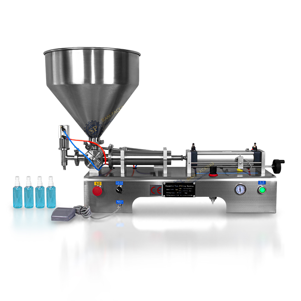 เป็นเครื่องบรรจุของเหลวที่ทำงานด้วยระบบ นิวเมติกส์ โดยการควบคุมการบรรจุด้วยกระบอกสูบ ปรับตั้งปริมาตรการบรรจุด้วย เซ็นเซอร์  ( SENSOR SWICH) ทำให้ ปริมาตรการบรรจุ แม่นยำสูง เปอเซ็นต์ คลาดเคลื่อน เพียง +- 0.5 % เท่านั้น ด้วยโครงสร้างเครื่องที่ทำด้วยสเตนเลสหนา มีความแข็งแรงทนทาน ป้องกันการเกิดสนิม 100 %  สามารถใช้งาน สะดวกสบาย สามารถปรับตั้งการบรรจุ ได้ ที่ 50 ML – 500 ML  รุ่นนี้จะเป็นระบบโถบรรจุ  เพียงตักสินค้าเติมลงในโถขนาด 35 ลิตร แล้วตัวเครื่องจะ บรรจุตามขนาดที่ตั้งค่าไว้ สามารถตั้งค่าการบรรจุ ช้า เร็วได้  ปัจจุบัน ถูกใช้การอย่างเเพร่หลายในอุตสาหกรรม เภสัชกรรมเครื่องสำอาง  / สารกำจัดวัชพืช ปุ๋ยน้ำ / น้ำยาปรับผ้านุ่ม น้ำยาล้างจาน / น้ำผลไม้ และอื่นๆที่เป็นของเหลว เป็นต้น